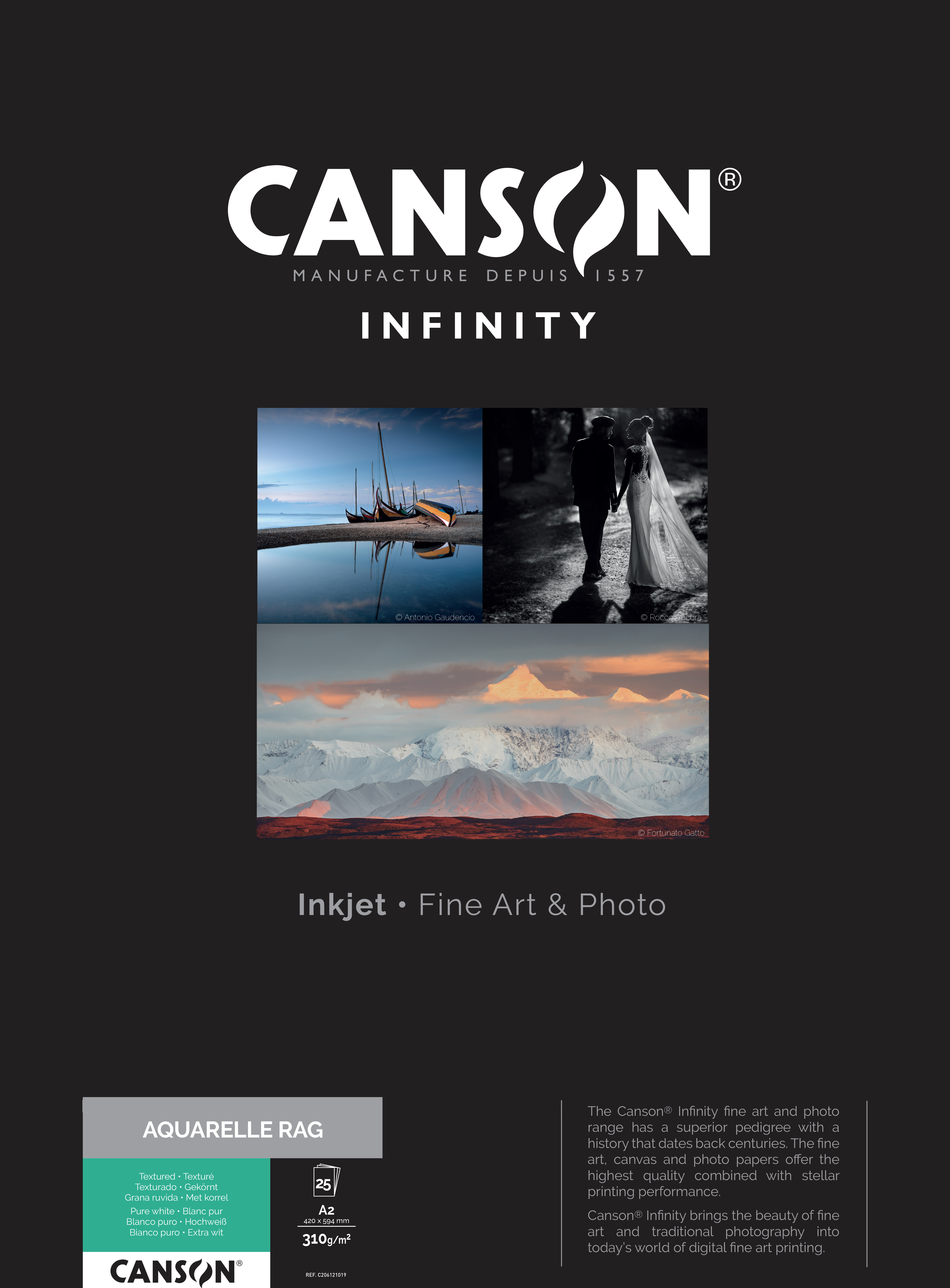 Arches® Aquarellpapier, die weltweite Nr. 1 der auf Rundsieb hergestellten Aquarellpapiere, ist jetzt auch in der Digital Fine Art & Photo-Serie erhältlich. Dieses Aquarellpapier aus 100% Hadern mit seiner einzigartigen Struktur, Oberfläche und seinem warmen Weißton erfüllt alle Ansprüche an ein traditionelles Künstlerpapier. Es entspricht Museumsqualität und ist hoch alterungsbeständig. Arches® Aquarelle Rag verleiht Reproduktionen von traditionellen Kunstwerken und Fotografien einen einzigartigen und unvergleichbaren Charakter.