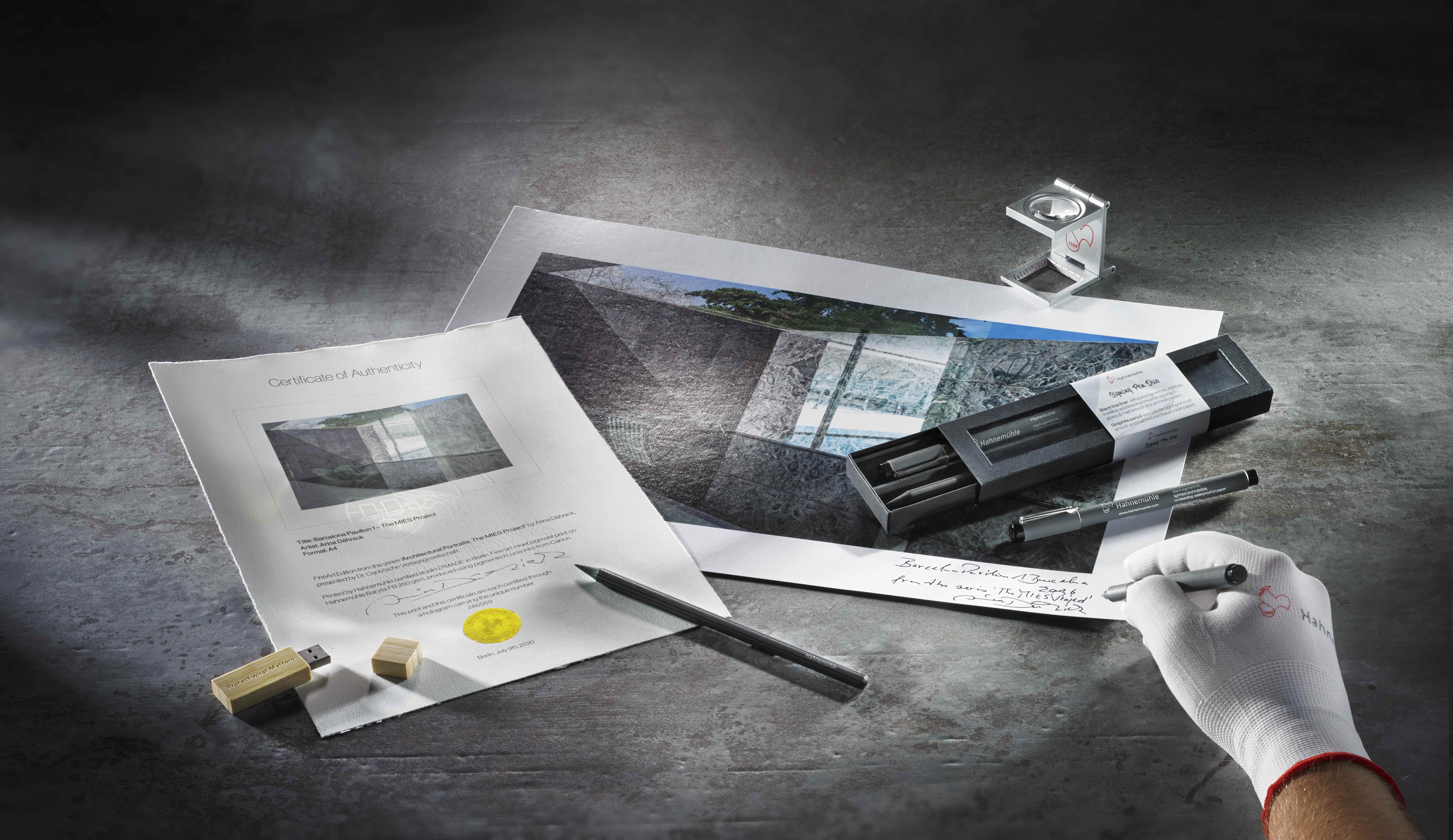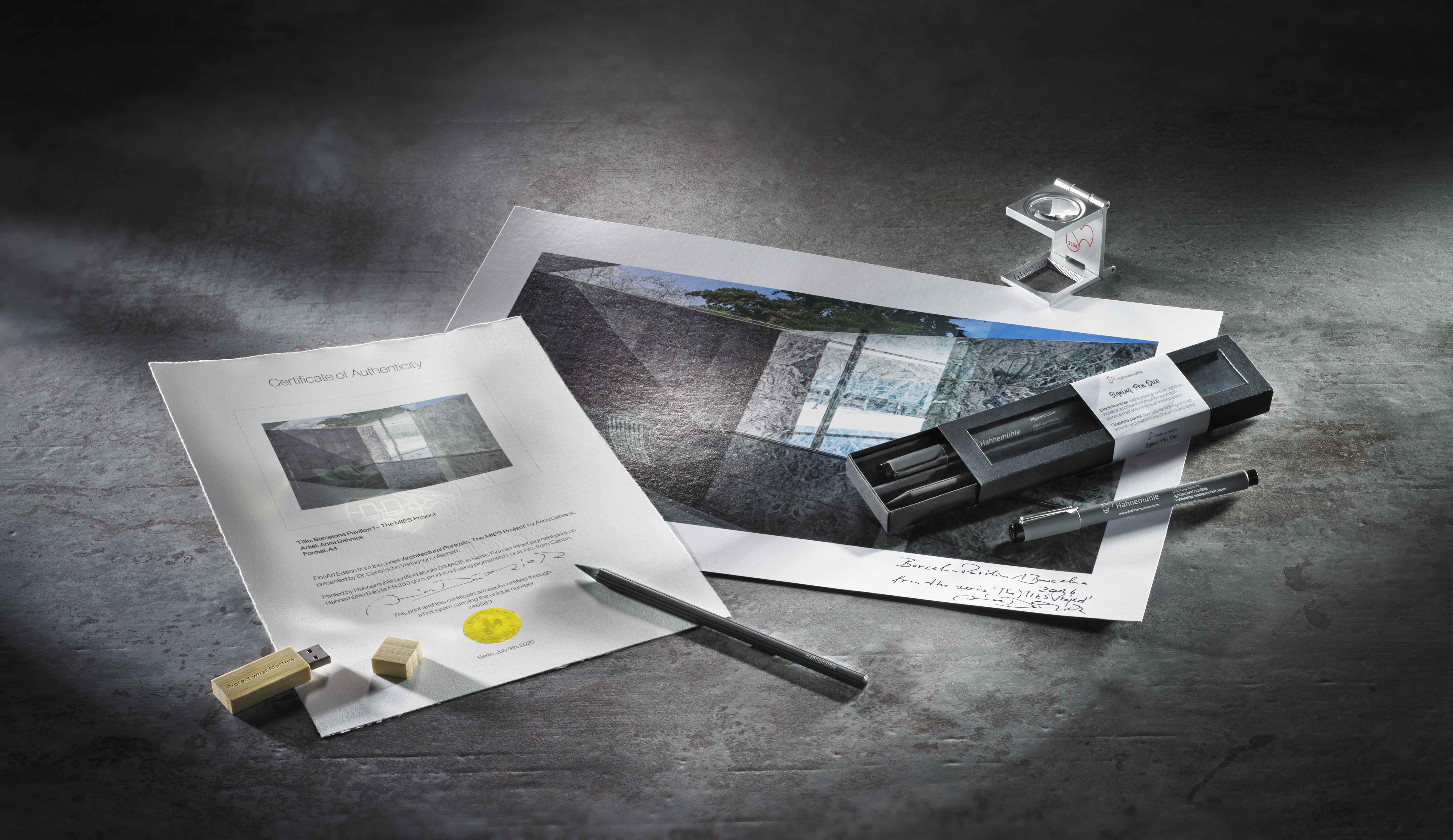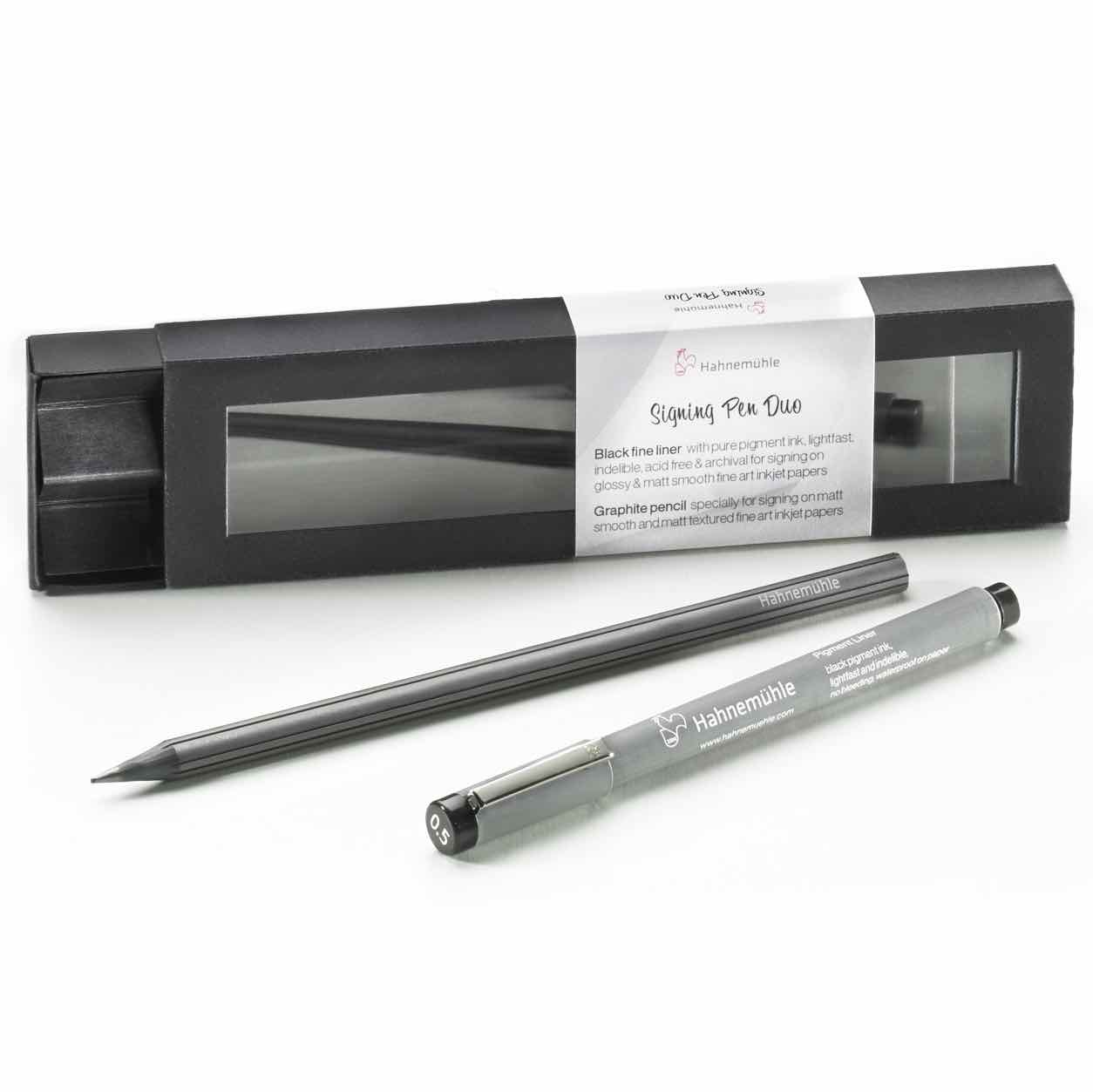 Um auch Bilder auf mattem und stark texturiertem Papier unverwechselbar zu machen, kommt der Pigmentliner in Kombination mit einem hochwertigen schwarzen Graphitstift in Archivqualität. Der edle Bleistift ist weich genug, um nicht durchzudrücken und hart genug, um die Unterschrift auf das Papier zu bekommen. Beide Signierstifte sind in einem modernen schwarzen Schiebeetui erhältlich.