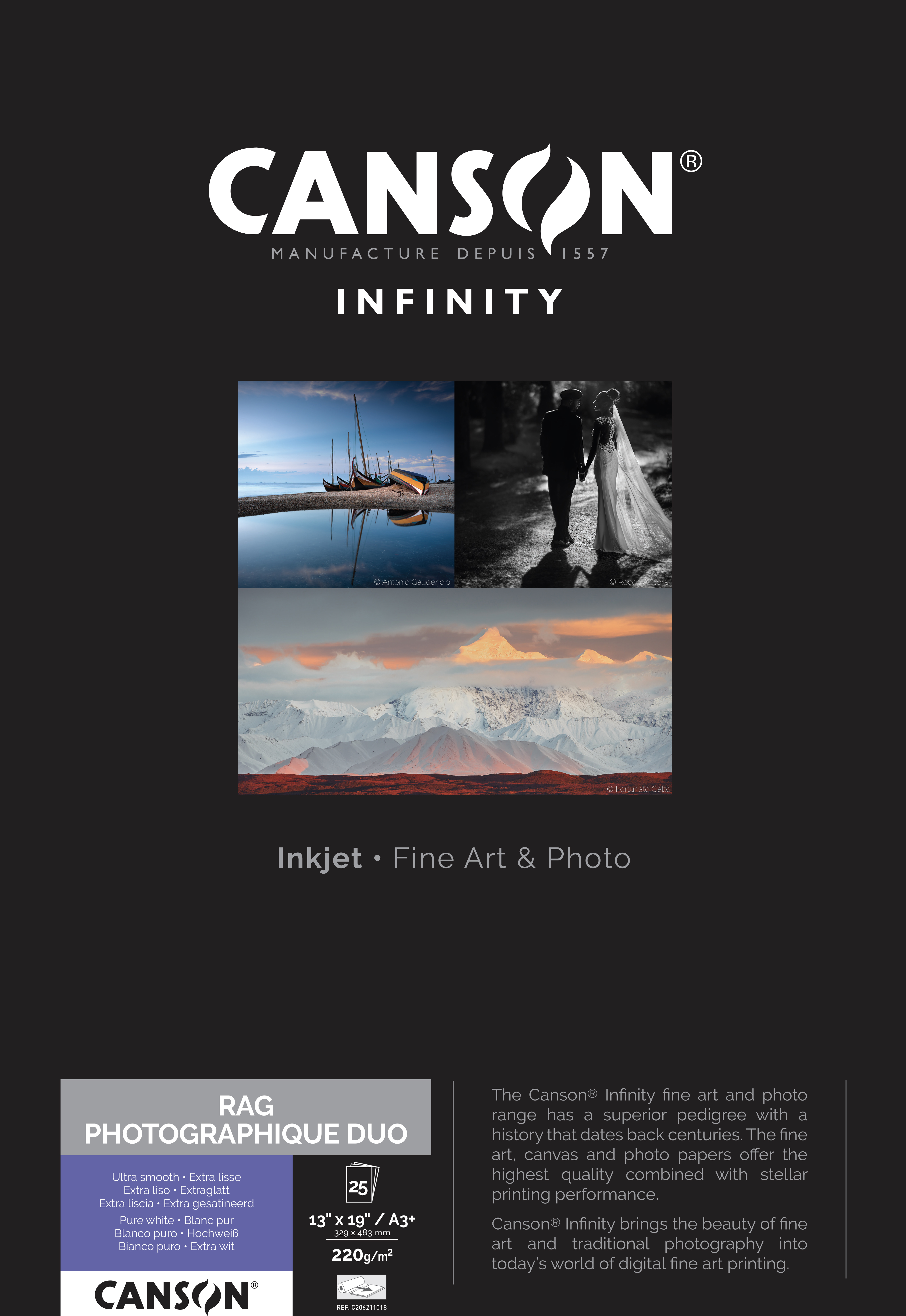 Rag Photographique Duo besteht aus 100% Hadern und ist doppelseitig beschichtet. Mit seiner feinen Oberfläche und seinem außergewöhnlich hochweißen Farbton ermöglicht es atemberaubende Drucke mit besonderer Farbbrillanz und tiefsten Schwarztönen. Seine doppelseitige Beschichtung eignet sich besonders für die Erstellung von außergewöhnlichen Kunstmappen und Fotoalben.